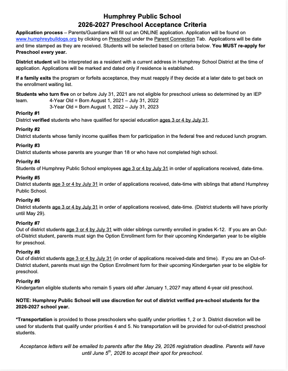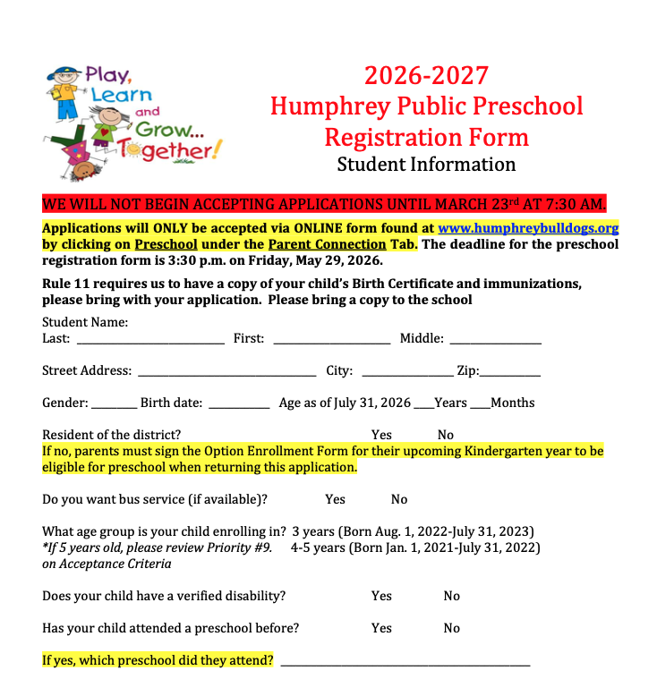 Click HERE to fill out the form ONLINE. The ONLY forms accepted will be the ones online. Below is a form to see what questions there are. Preschool Registration Form