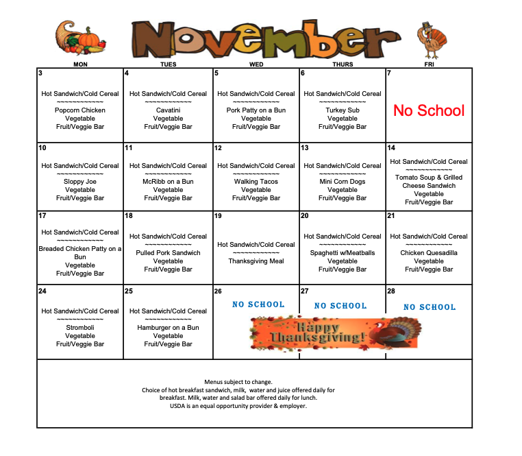 | Grades PreK - 3 - $2.90 | Choice of hot breakfast sandwich, cold cereal, milk, water and juice offered daily for breakfast. Choice of PB&J sandwich with cheese stick or yogurt, milk, water and salad bar offered daily for lunch |