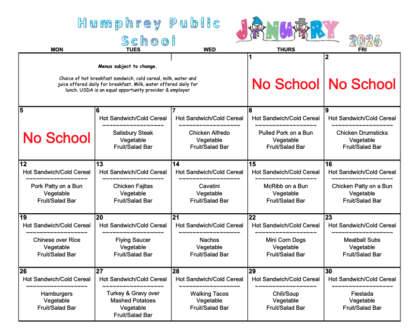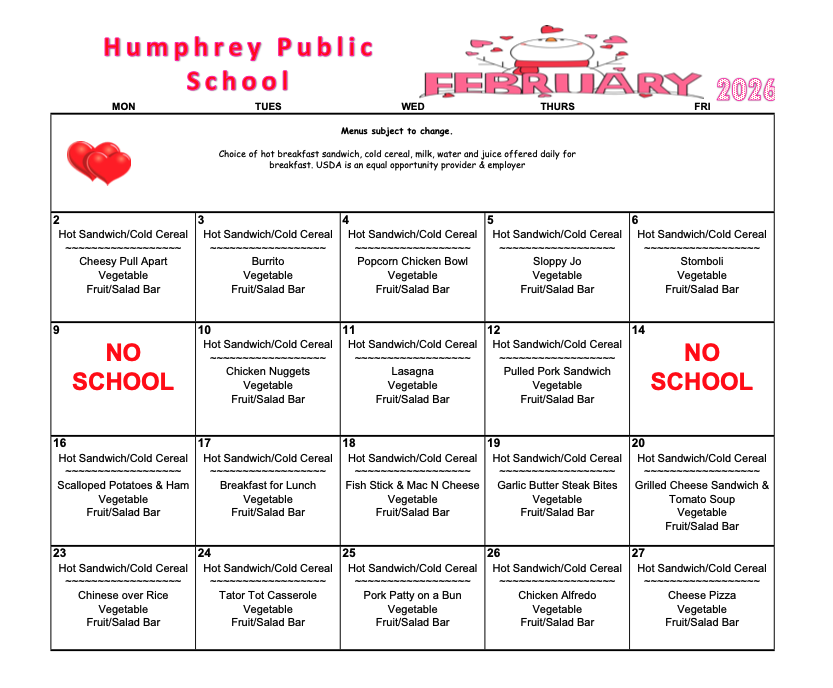 Choice of hot breakfast sandwich, cold cereal, milk, water and juice offered daily for breakfast. Choice of PB&J sandwich with cheese stick or yogurt, milk, water and salad bar offered daily for lunch |